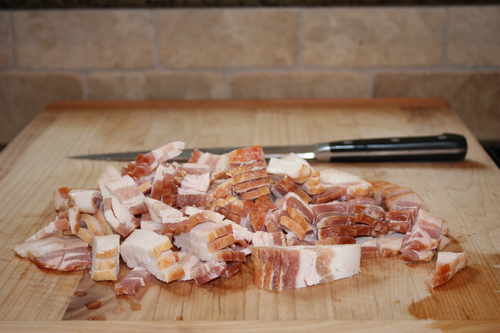 I happened to have some bacon in the fridge. Tyler brings home the bacon, literally. So, I sort of looked up a few ways to do this and picked the quickest and easiest way possible to make this. I chopped up the yummy bacon into smaller pieces.